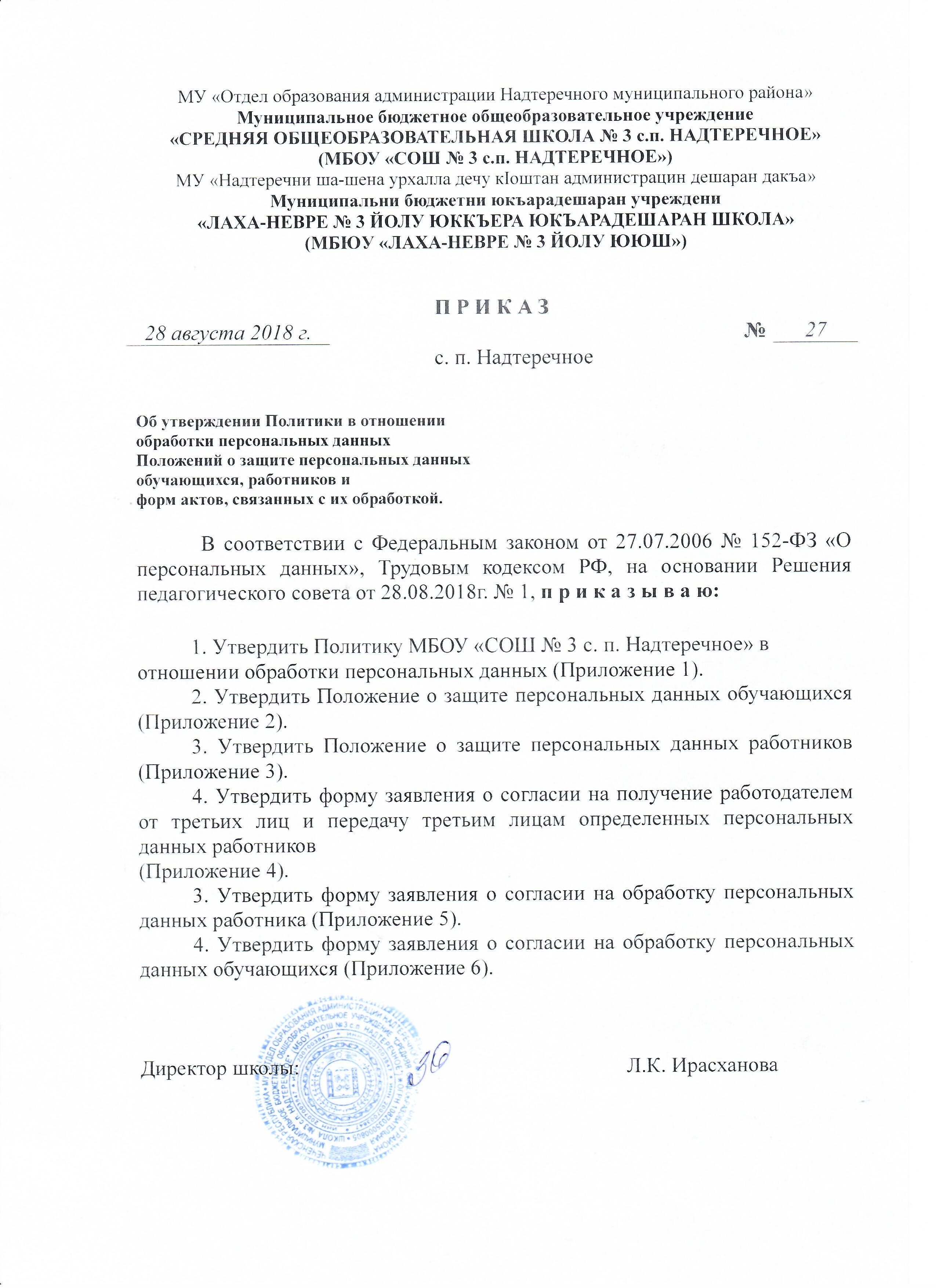 Приказ Об утверждении Политики в отношении обработки персональных данных Положений о защите персональных данных обучающихся, работников и форм актов, связанных с их обработкой.