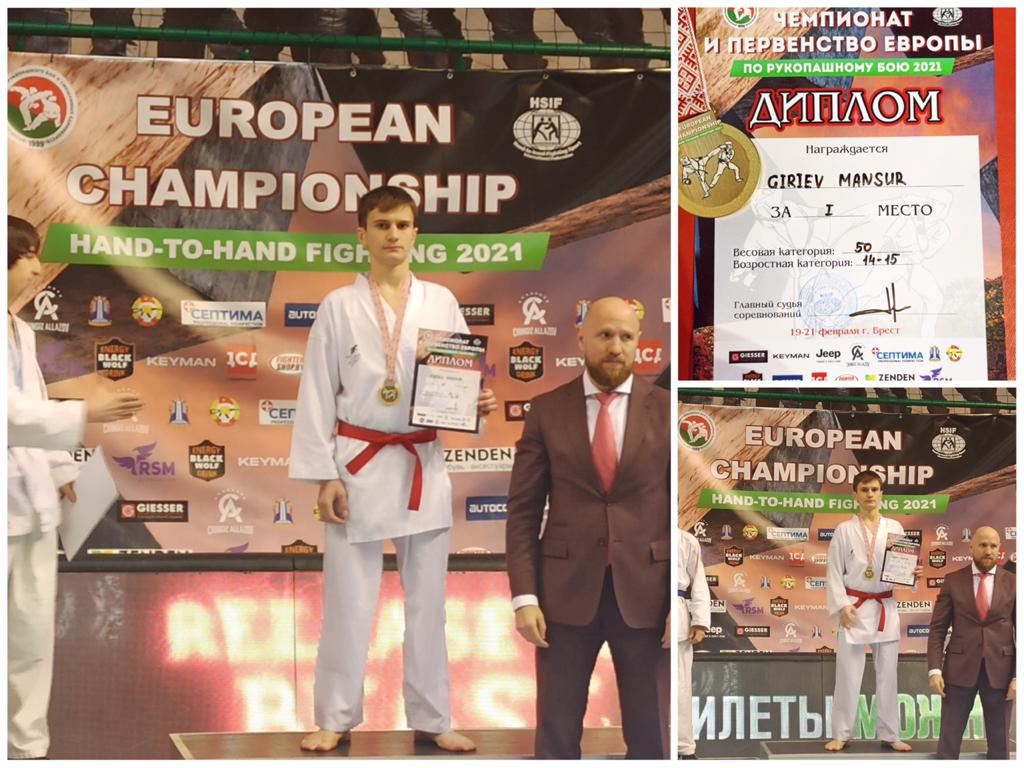 На Чемпионате и первенстве Европы по рукопашному бою среди юношей 14-15 лет в весовой категории 50 кг занял 1 место ученик МБОУ "СОШ № 3 с. п. Надтеречное" Гириев Мансур Муслимович.