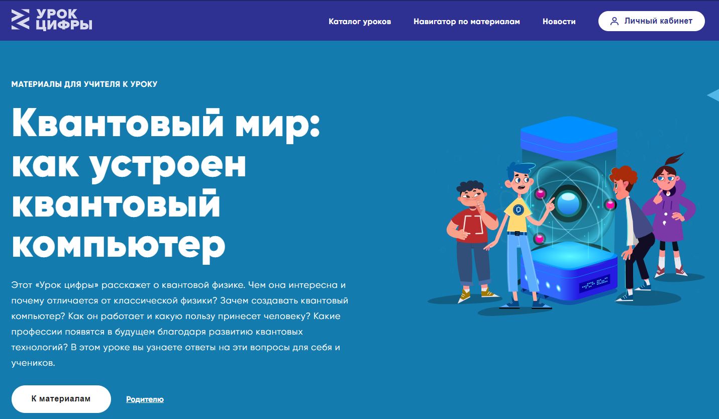 Урок проводится по материалам сайта урокцифры.рф. Учебные материалы разработаны Госкорпорацией Росатом (Квантовые технологии) при поддержке Российского квантового центра и помогают ученикам познакомиться с миром квантовой физики и квантовых разработок, а также выбрать актуальную профессию будущего.