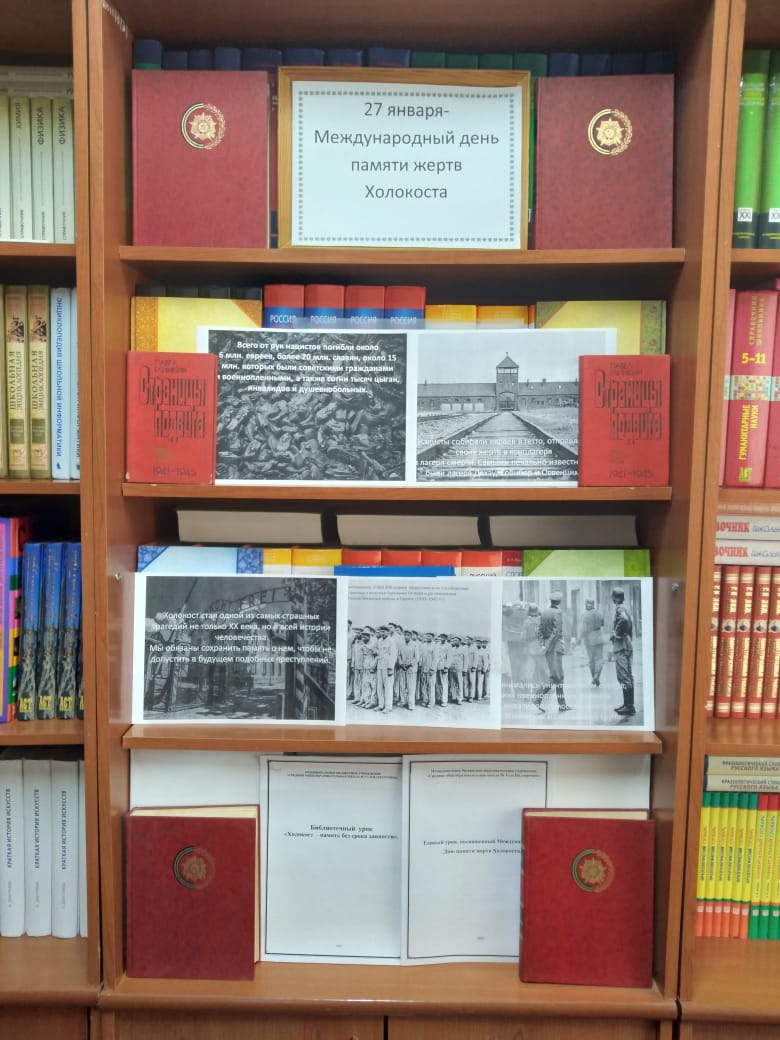 27.01.2023Заведующей библиотекой МБОУ "СОШ № 3 с. п. Надтеречное" Ахматхановой А.С. в рамках Недели памяти, посвященной Международному дню памяти жертв Холокоста, проведена выставка, целью которой стало толерантное отношение к людям разных национальностей, формирование сочувствия и сострадания к жертвам массового убийства.