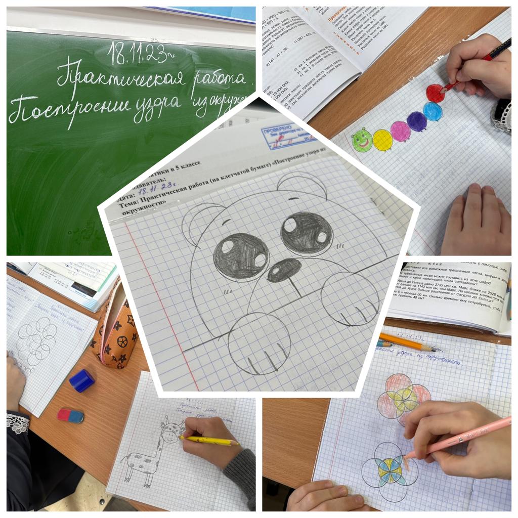 На уроке математики в 5 «а» классе провели практическую работу «Построение узора из окружности».Учитель: Тазиева Р.А.