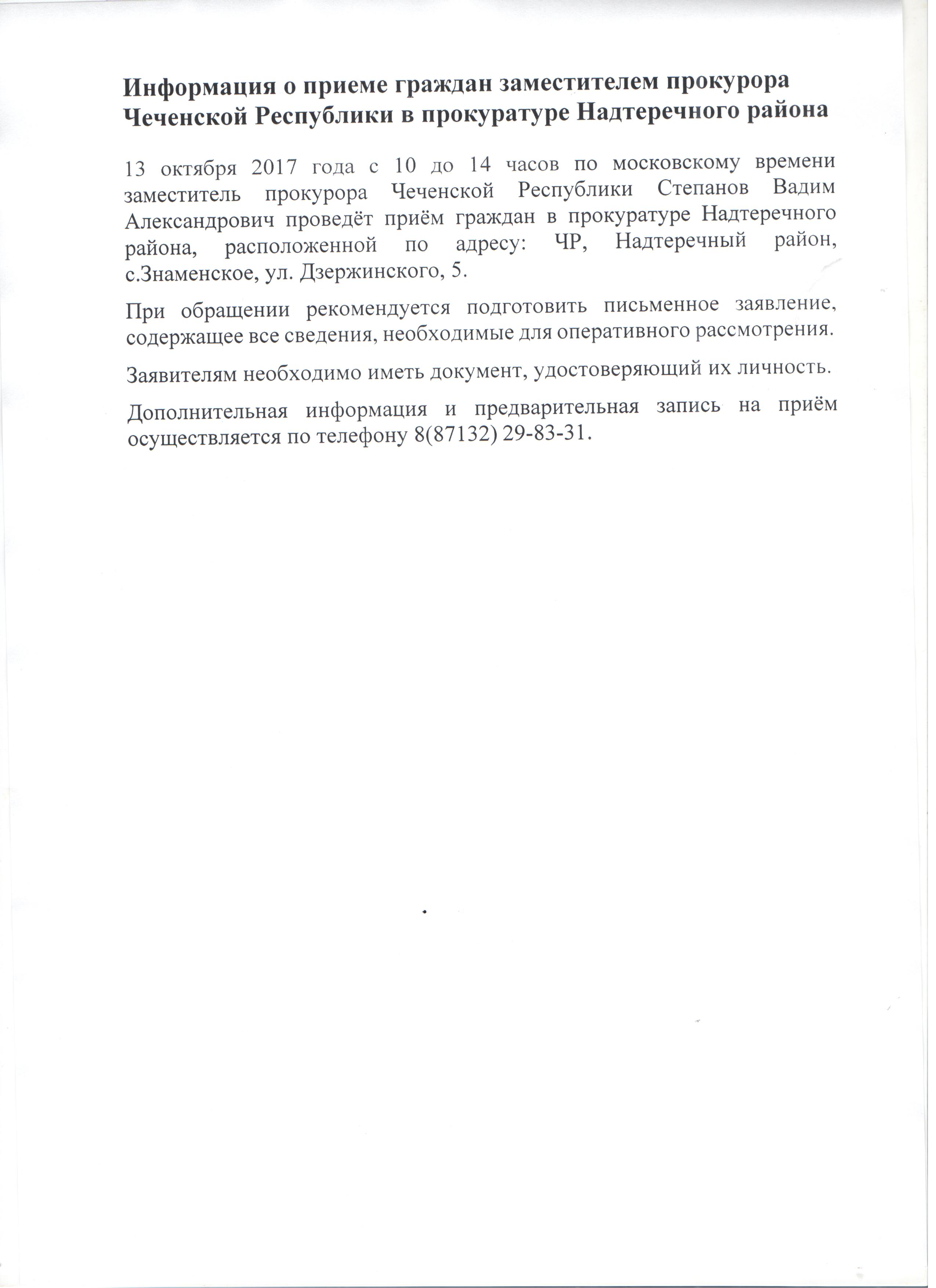 Информация о приеме граждан заместителем прокурора Чеченской Республики в прокуратуре Надтеречного района