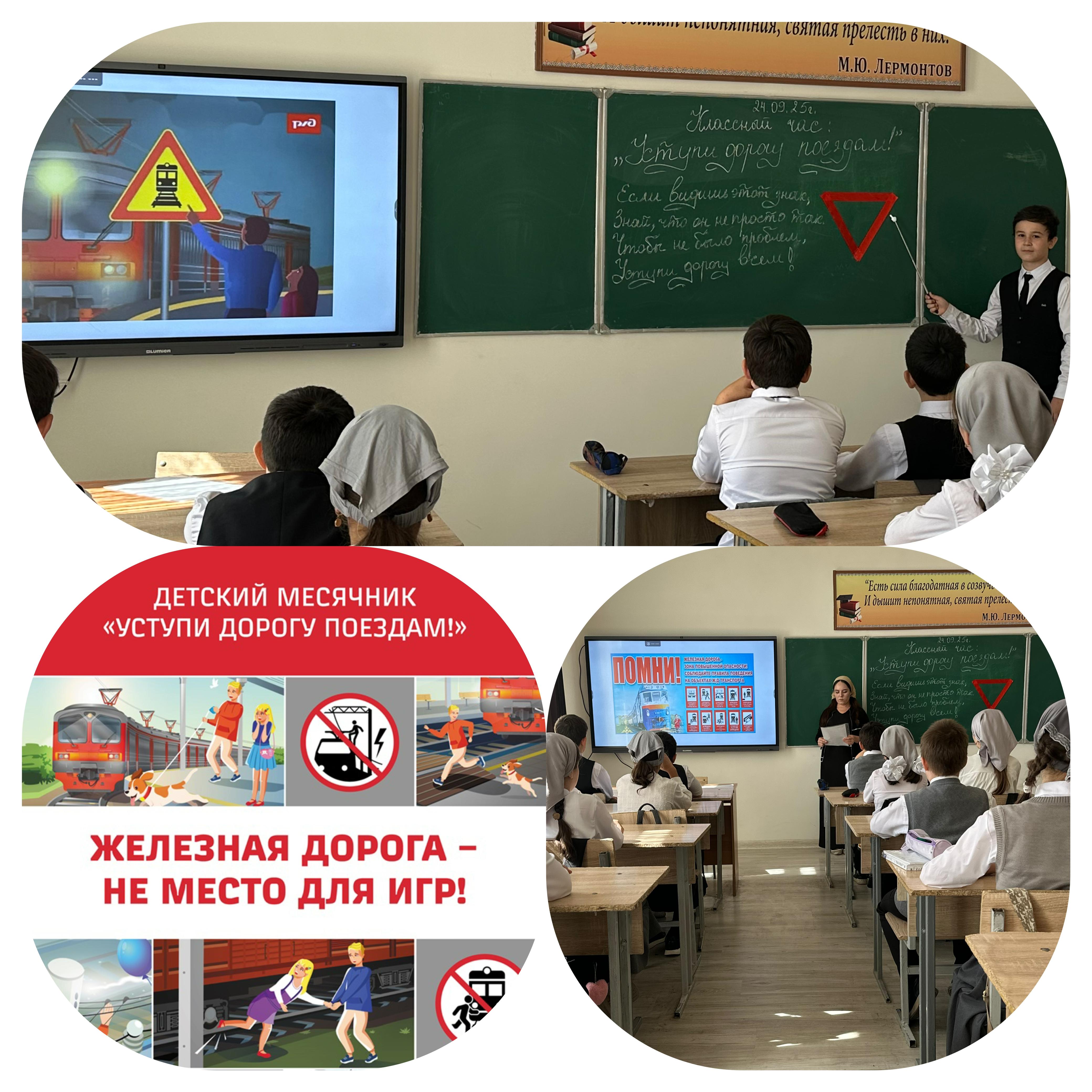 24.09.2025Классный час на тему "Уступи дорогу поездам!" посвящён правилам безопасного поведения на железной дороге, чтобы предотвратить несчастные случаи и травмы. Основная идея – железная дорога является зоной повышенной опасности, где необходимо строго соблюдать правила, чтобы избежать трагических последствий. Главное – быть внимательным, не играть на путях, использовать специальные переходы и всегда помнить, что даже короткое пренебрежение правилами может привести к непоправимому. Классный руководитель:Тазиева Р.А.