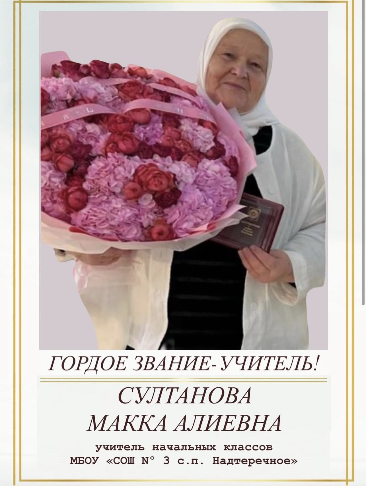 02.10.2025СУЛТАНОВА МАККА АЛИЕВНА,ЗАСЛУЖЕННЫЙ УЧИТЕЛЬ ЧЕЧЕНСК0Й РЕСПУБЛИКИ, РАБОТАЕТ УЧИТЕЛЕМ НАЧАЛЬНЫХ КЛАССОВ В МБОУ «СОШ N° 3 с.п. НАДТЕРЕЧНОЕ».Она не просто учит - она открывает двери в мир открытий, где каждый ребенок становится первооткрывателем.Макка Алиевна - это воплощение педагогической мудрости, отмеченной высшими наградами. Ее отличают Почетная грамота Парламента Чеченской Республики и Почетная грамота Министерства образования и наукиРоссийской Федерации, а в сентябре 2025 года, по Указу Главы Чеченской Республики, ей было присвоено звание«Заслуженный учитель Чеченской Республики». Эти награды - не просто символы, а признание полувека неустанного труда, посвященного воспитанию патриотов, интеллектуалов и просто добрых людей.B основе ее педагогического кредо - вечная истина, заимствованная у немецкого мыслителя Адольфа Дистервега: «Плохой учитель преподносит истину, хороший учит ее находить». Макка Алиевна верит, что истинное обучение рождается в действии и самостоятельном поиске. Она превращает каждый урок в увлекательный эксперимент, где дети не пассивно слушают, а активно исследуют, удивляются и растут.«Моя главная задача - дать ребятам стимул, цель и мотивацию, а затем показать, какими средствами они могут их достичь», - делится она. В ее классах царит атмосфера творчества и доверия, где ошибки - это шаги к успеху, а любопытство - ключ к знаниям.В муниципальном проекте «Гордое звание - Учитель!», реализуемом в Надтеречном районе как важная часть плана мероприятий Года начальной школы, Макка Алиевна - не просто участница, а символ вечной ценности учительского труда. Этот проект призван отметить неоценимый вклад учителей начальных классов в образование и воспитание подрастающего поколения, повысить престиж профессии и распространить передовой педагогический опыт. В нем принимают участие педагоги общеобразовательных организаций Надтеречного района с ведомственными наградами регионального или федерального уровня, подтверждающими их профессиональное мастерство.